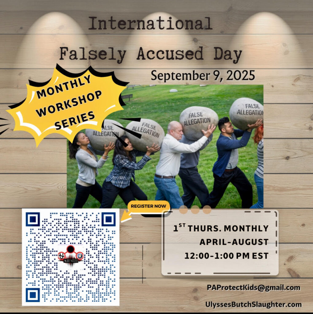 Stop False Allegations Against Men, Interference with Child Custody Coalition (IC3) & PA Protect Kids are inviting you to a powerful series of workshops held on the first Thursday of each month from 12:00 PM to 1:00 PM EST, May 1, 2025, through September 9, 2025, in honor of International Falsely Accused Day.